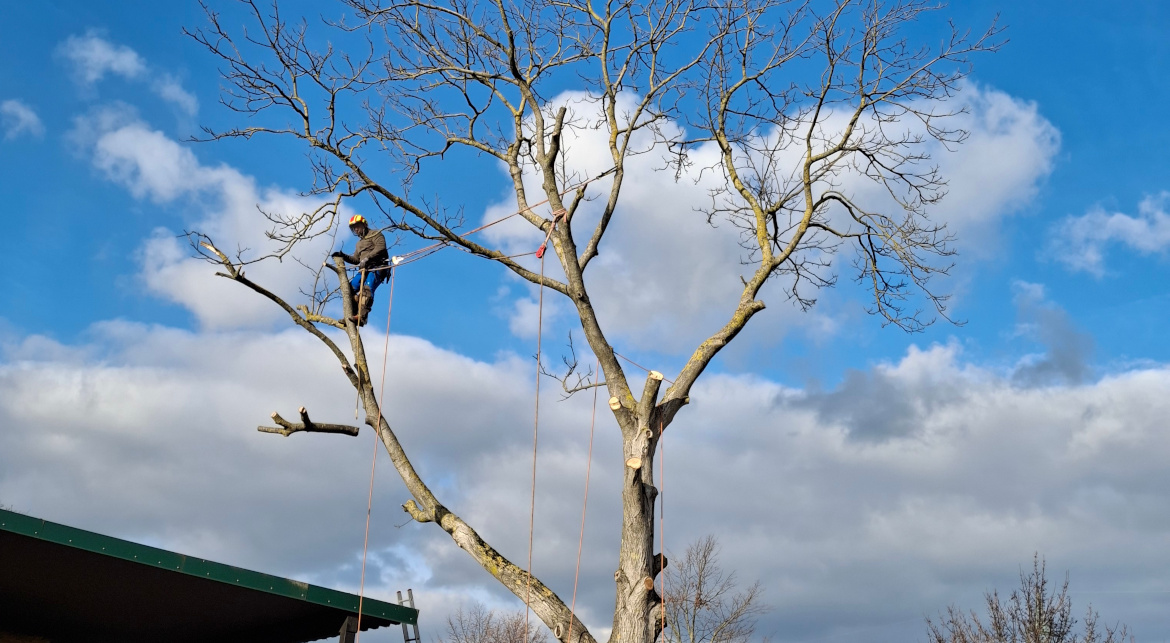 Unser Team erfahrener Baumkletterer nahm sich dieser Aufgabe an. Mithilfe von Seilklettertechnik zerteilten sie die Krone Stück für Stück von innen heraus. Gut gesichert und am Boden mit dem Kollegen verbunden, kann sich der Kletterer bis in äußere Kronenbereiche vorwagen und die Äste so ablängen, dass sie schadlos zu Boden fallen.