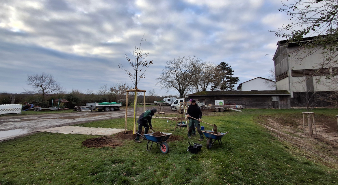 Alte Bäume sind unersetzlich. Muss doch mal einer weichen, sollten mindestens ein bis zwei neue gepflanzt werden, auch wenn sie Jahrzehnte brauchen, bis sie den ökologischen Wert des Alten ersetzen können. Wir haben uns für das Pflanzen zweier Esskastanien auf dem Gelände von Mayer & Bühler entschieden. Diese dürfen nun ganz in der Nähe des ehemaligen Walnussbaumes wachsen und hoffentlich gedeihen. Die Esskastanie (Castanea sativa) kommt ursprünglich aus dem Mittelmeerraum und wurde in Deutschland von den Römern eingeführt. Vor allem im Pfälzer Wald gibt es große Bestände davon. Sie kann 500 Jahre alt werden, ist anpassungsfähig, wärmeliebend und trockenheitsverträglich. Ihre Früchte, in der Pfalz als Keschde bekannt, werden von Mensch und Tier als Nahrung geschätzt. Das witterungsbeständige Holz kann vielfältig genutzt werden und ist derzeit vor allem als Staketenzaun im Einsatz. Mit der Pflanzung von Bäumen wirken wir in die Zukunft, weit über unsere eigene Lebenszeit hinaus. Sie sind ein Geschenk an unsere Nachkommen. Heute freuen wir uns schon auf die ersten heißen Maroni, vielleicht schon im nächsten Herbst.