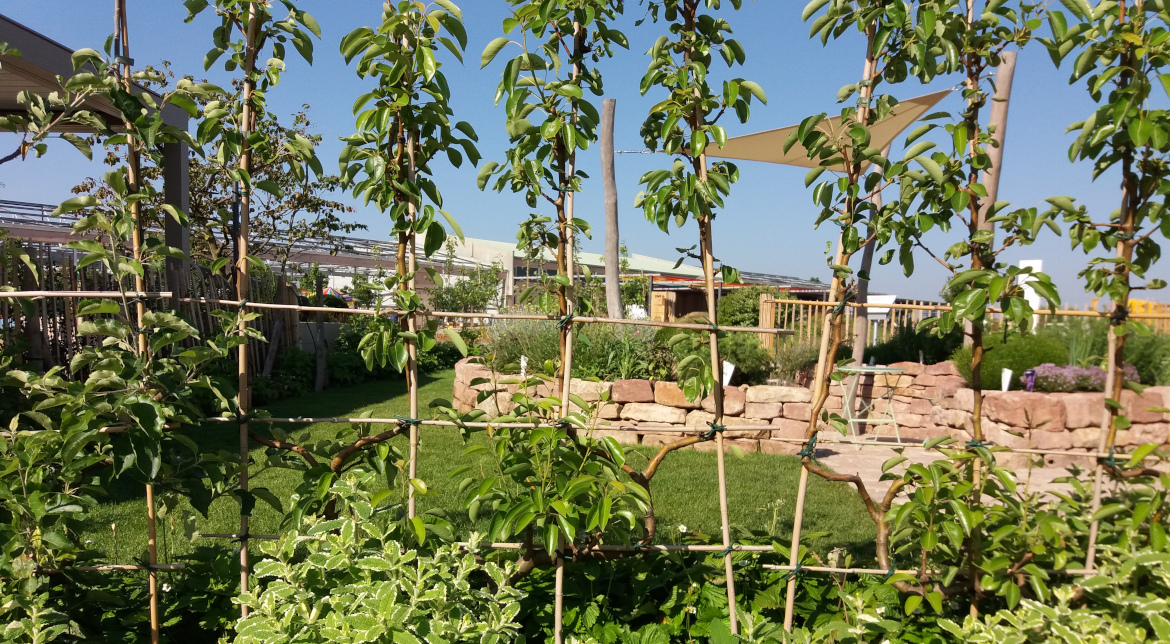 Auf kleinem Raum können Obstbäume als Spalier gezogen werden. Hier fungiert das Spalierobst als lebendige Einfriedung. Zwischen den belaubten Zweigen dürfen Passanten in die tieferen Bereiche des Gartens spähen. Wenn mein täglicher Weg an einem solchen, lebenden Zaun vorbeiführt, werde ich mich im Frühling an den Blüten erfreuen und im Laufe des Sommers das Reifen der Früchte beobachten. Vielleicht schenkt mir die Besitzerin einen Apfel, der mich schon länger anlacht. Im Herbst fallen allmählich die Blätter und mir wird bewusst, dass es bald Winter wird. Irgendwann beobachte ich dann, wie die Äste der Spalierbäume so gestutzt werden, dass die schmale Form erhalten bleibt und das Fruchtholz gefördert wird. Wenn es der Zufall will treffe ich dabei die Besitzerin und wir kommen ins Gespräch…